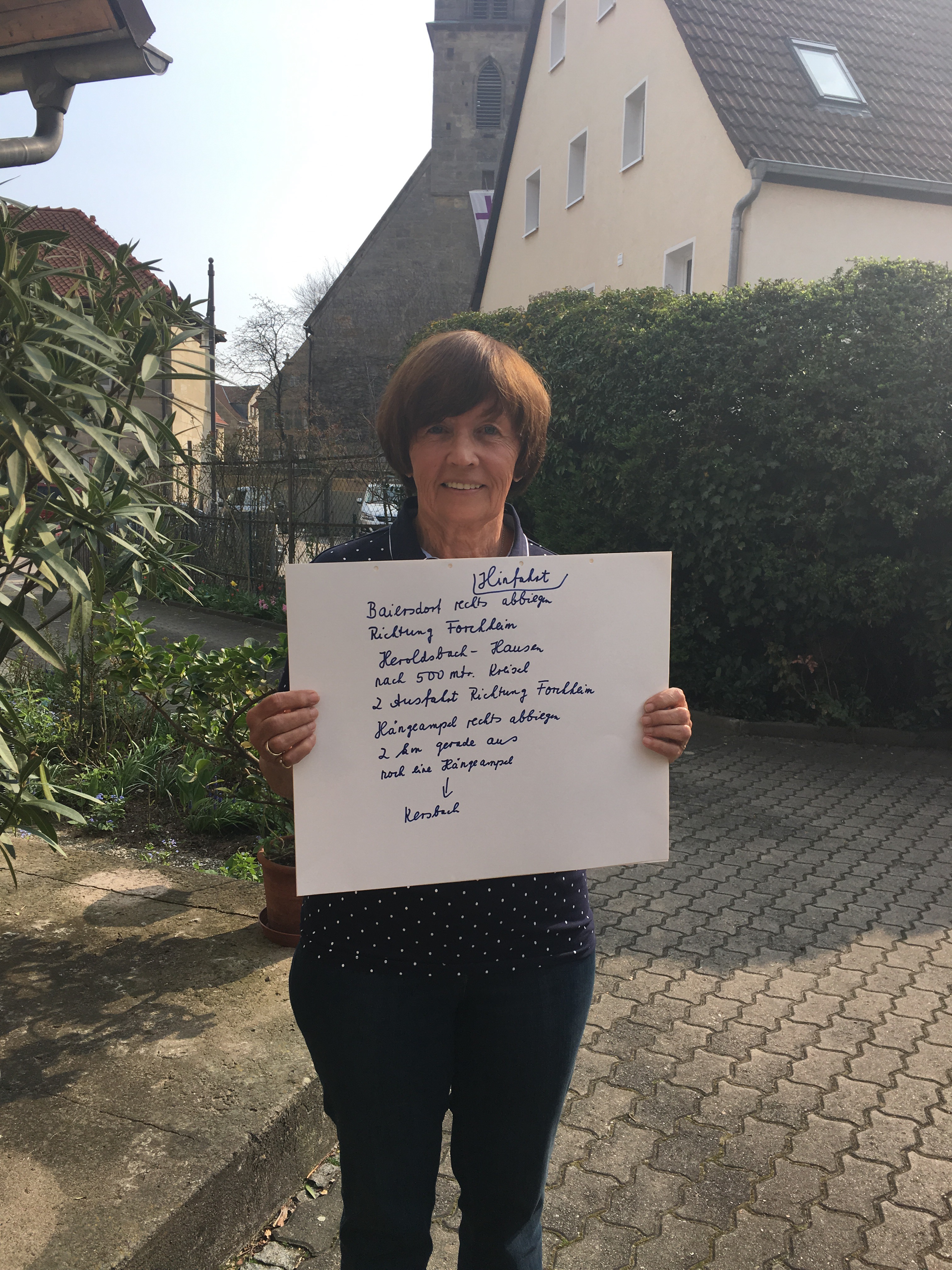 Früh um 9 Uhr will meine Mutter losfahren. Um 9.45 Uhr erhalte ich ihren ersten Anruf. Sie ist irgendwo in Forchheim gestrandet. Ich versuche telefonisch zu helfen: rechts rum, dann links KERSBACH!!! Ich hoffe das Beste. 10 Minuten später erfolgt ein weiterer Anruf: Ich bin in Hausen! Gebetsmühlenartig wiederhole ich meine Worte: wenden, dann links K-E-R-S-B-A-C-H!!!! Ich bin in Panik, nicht dass sie aufgibt und der ganze Aufwand umsonst ist! Muss ich die gelben Engel oder die grünen Retter anrufen? Vor meinem geistigen Auge formieren sich Hubschrauber, Spürhunde und die Durchsage auf Bayern Eins: Seit Sonntag, dem 2. April wird die 75 jährige Karin F. aus C. vermisst. Vermutlich irrt sie desorientiert im Raum Forchheim umher…