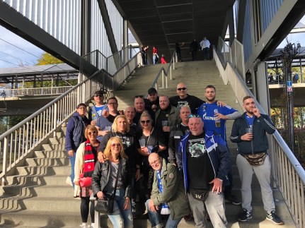 Als Club Fans werden wir liebevoll von Marcos Freunden aufgenommen. Da ist Micha, Schließer im Gefängnis Gelsenkirchens, ein bulliger Typ ca. 50 Jahre mit Irokesenschnitt. Nach den ersten Pils und diversen Mexikanern und Nordstürmen im Abgang liegen wir uns in den Armen. Da ist noch Frank, Sprengmeister im Bergbau, 60 Jahre und Rentner seitdem er 43 ist. Er ist dem Strukturwandel zum Opfer gefallen wie das ganze gebeutelte Stadtviertel. Die Frauen sind eine Spur zu blond und zu faltig, der Lebenswandel auf Schalke hinterlässt seine Spuren. Ab einem gewissen Pegel sind wir alle blau und weiß.