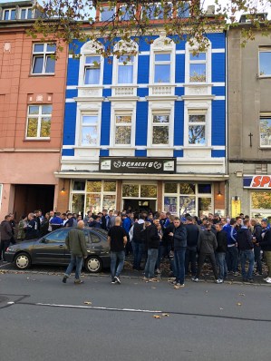 Um weitere Erkenntnisse diesbezüglich zu gewinnen, fahren wir in den Ruhrpott zu Becki und Marco. Dort ist es schnörkellos, ehrlich, deutlich und klar. Das fängt bei den Verkehrsstaus an und endet bei der Kumpelromantik der stillgelegten Zechen. Außerdem wird der Fußball im Revier groß geschrieben. In unserem ist das Schalke 04, der eine rege Fanfreundschaft mit unserem Glubb unterhält. An diesem Woche ist Derbytime: Schalke gegen Dortmund. Schon Samstag gegen 12 Uhr machen wir uns auf die Schalker Meile. Sie liegt auf dem direkten Weg in die Veltins Arena. Diese liegt in einem weniger prekären Stadtviertel von Gelsenkirchen – in Beverly Buer. Schalke ist jedoch der bekannteste Stadtteil Deutschlands, ein Ort, der Fußballgeschichte geschrieben hat. Am Schalker Markt geht es zum Vorglühen in den Schacht 6, einem Supporter Club, selbstredend trägt die Fassade und die Inneneinrichtung des Hauses blau -weiß. Es steht alles im Zeichen des Derbys.