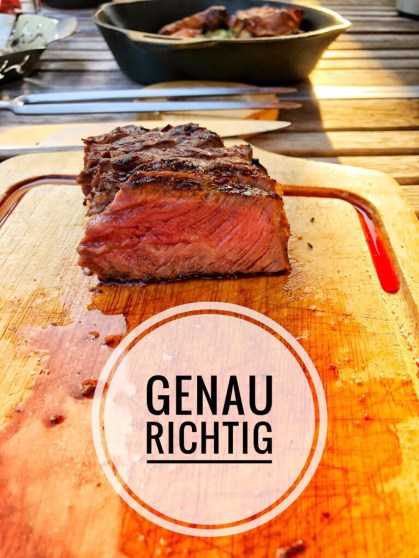 Selbiges mit dem Rind 4 cm stark und Röstaromen bis in die letzte Pore. Die nächsten sieben Jahre muss natürlich weiter optimiert werden, viele Schichten am Grill, demnächst mit feuerfesten Grillhandschuhen, müssen gefahren werden – der Weg ist das Ziel.